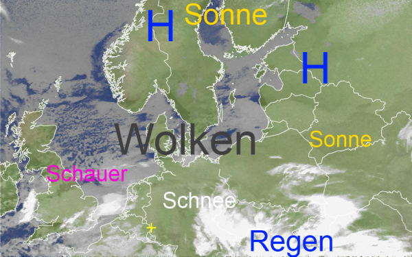 Im Bereich der Hochdruckgebiete über Skandinavien und dem Baltikum scheint gebietsweise die Sonne. Meist hält sich jedoch eine zähe tiefhängende Wolkendecke.
