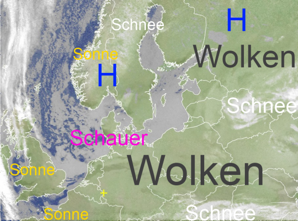 In Folge des "Lake Effektes ziehen einige kompaktere Schauerwolken von der Ostsee über Dänemark und Schleswig-Holstein hinweg Richtung Nordsee.