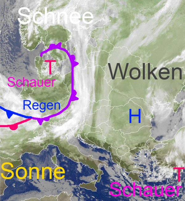 Auf der Rückseite der Fronten des Sturmtiefs bei Dänemark strömt kältere Polarluft nach Mitteleuropa. Aus den dichten Wolken fällt Regen. Dieser geht im Laufe des Abends bei allmählich zurückgehenden Temperaturen teilweise bis in tiefere Lagen in Schnee über.