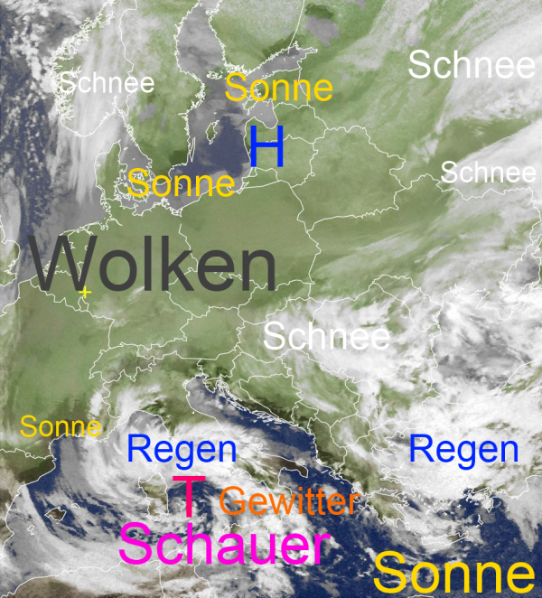 Sonst präsentiert sich der Europäische Kontinent häufig wolkenverhangen. Die Sonne kommt nur über kleineren Flächen zum Zuge.