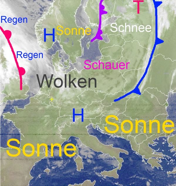 Während über die Nordhälfte unseres Kontinentes Wolkenbänder von Störungsfronten mit Niederschlägen hinweg ziehen dominiert in der Südhälfte freundliches Wetter mit blauem Himmel und reichlich Sonnenschein. Mitteleuropa bildet dabei ungefähr die Grenze. Von Winter ist bei uns momentan keine Spur.