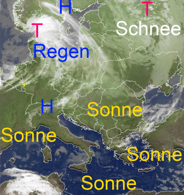 Das umfangreiche Hoch mit Zentrum über den Alpen lässt über Südeuropa und auch Teilen Mitteleuropas die Sonne scheinen und bringt vorfrühlingshafte Temperaturen.