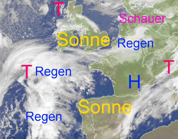 Im Bereich des Hochs über Südfrankreich, sowie über Teilen der Britischen Inseln strahlt längere Zeit die Sonne.