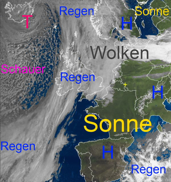 Eine ausgeprägte Wolkenspirale, ausgehend des Tiefs bei Island reicht vom Nordmeer, über die Britischen - Inseln bis über den Atlantik. Aus diesen Wolken fällt Regen. Diese Zone erreicht morgen in abgeschwächter Form den Nordwesten von Deutschland. Dahinter wird frischere Luft herangeführt.