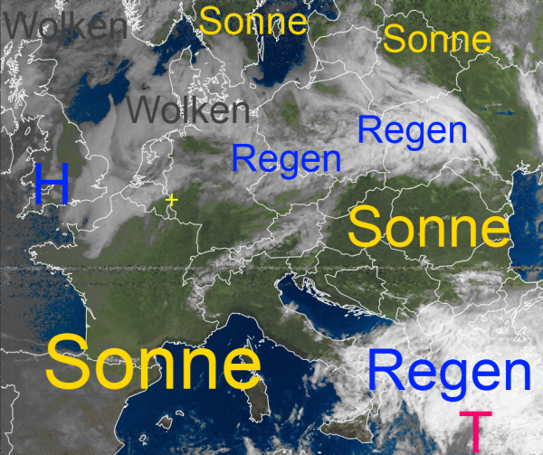Kompakte Regenwolken findet man im Bereich des südeuropäischen Tiefdruckgebietes.
