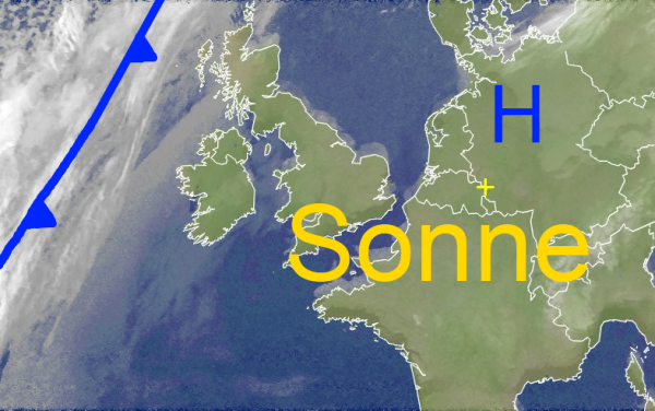 Die Wolken der Kaltfront über dem Atlantik bleiben uns noch erspart. Erst im morgigen Tagesverlauf erreicht die Front in abgeschwächter Form den Nordwesten unseres Landes.