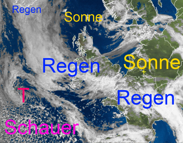 Über größeren Teilen Mitteleuropas lacht zunächst noch die Sonne von einem blauen oder nur leicht bewölkten Himmel. Aber auf dem Atlantik hat sich bereits ein mächtiges Tiefdruckgebiet entwickelt, welches seine Regenwolken bereits nach Frankreich und Westeuropa schickt. Im Tagesverlauf dürfte sich der Himmel in der Westhälfte unseres Landes verdichten und zum Abend nehmen Regenfälle, Schauer und örtliche Gewitter zu. Dabei können zum Teil auch größere Regenmengen fallen.