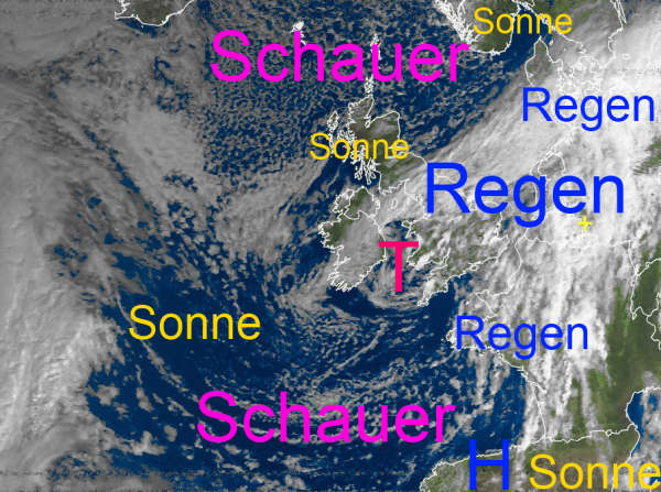 Das Tief bei den Britischen Inseln zieht mit seinen kompakten Regenwolken über Mitteleuropa hinweg nach Osten. Dabei können in unserem Land regional durchaus beachtliche Niederschlagsmengen von über 25 Liter pro Quadratmeter fallen. Auf der Rückseite des Tiefs erkennt man an der wabenförmigen Schauerbewölkung die kühlere Polarluft, die über dem Atlantik weit nach Süden strömt. Morgen kommt sie auch in Deutschland an und lässt die Temperaturen sinken. Zwischen den Schauerwolken findet sich immer wieder mal Platz für die Sonne.
