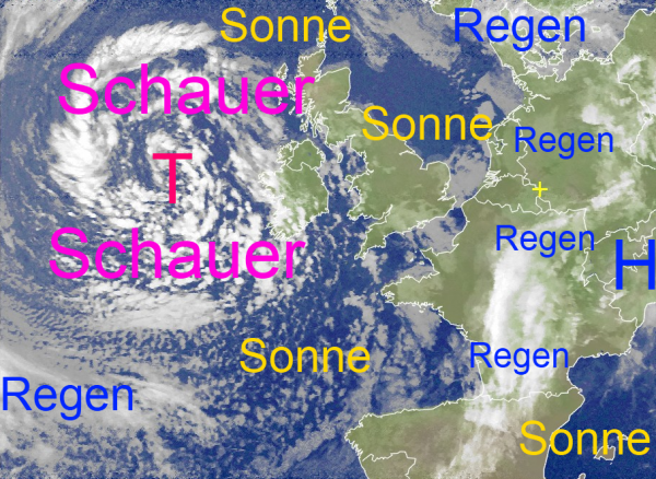 Das Tief über dem Atlantik produziert eine Menge Regen- und Schauerwolken. Es wandert bis morgen unter leichter Abschwächung zu den Britischen Inseln. Auf seiner Vorderseite transportiert es jedoch mit südwestlichen Winden milde Luft nach Deutschland.