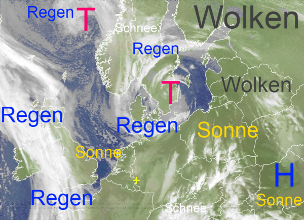 Die beiden Tiefdruckgebiete westlich von Norwegen und Südschweden entfernen sich mit ihren Regen und Schneewolken nach Norden, so dass die Wolkendecke gebietsweiße aufreißen kann und der Sonne Platz macht.