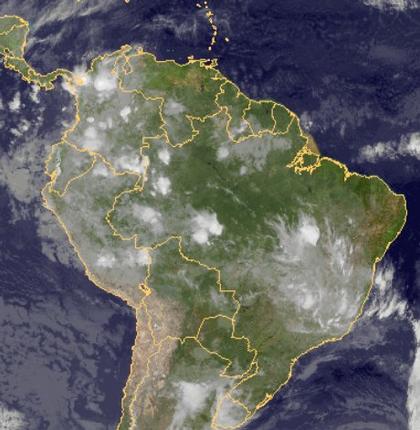Auf dem Satellitenbild von Südamerika sind vor allem über Brasilien und Kolumbien starke Schauer- und Gewitterzellen erkennbar. Diese entwicklen sich im Bereich der innertropischen Konvergenzzone.