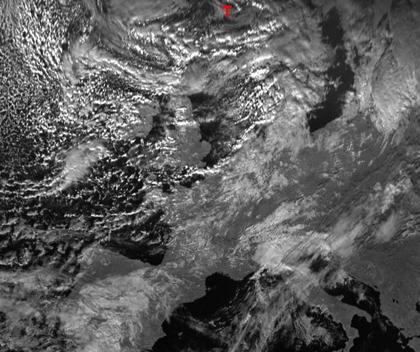 Das Tief 'Max' liegt zwischen Schottland und Norwegen. Auf seiner Südseite bringt es in einer westlichen Strömung feuchte, und etwas kühlere Luftmassen nach Europa. Vor allem über dem Atlantik und der Nordsee bilden sich in diesen Luftmassen Schauer und Gewitter. Diese Schauer- und Gewitterzellen sind auf dem Satellitenbild von Donnerstag Mittag gut zu erkennen.