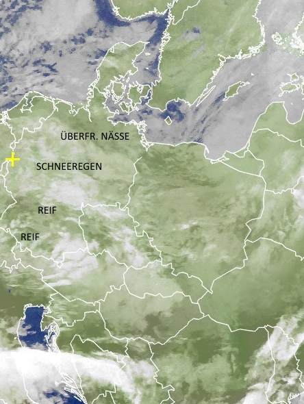 Dieser Montag brachte den ersten Schnee in den Mittelgebirgen bis runter auf 500 m Höhe. Im Flachland war es nasskalt. Nachts gibt es Glätte durch Reif in Bayern und durch Schnee in NRW bis 300 m Höhe. In Niedersachsen droht überfr. Nässe und Reif.
