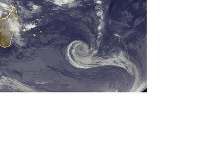 Die Wolkenspirale Südöstlich von Madagaskar gehört zu dem ehemaligen Tropensturm 'Edzani', der sich mittlerweile zum Sturmtief abgeschwächt hat. Zurzeit erreicht er mittlere Windgeschwindigkeiten von 74, in Böen 93 km/h und zieht weiter Richtung Südwesten.