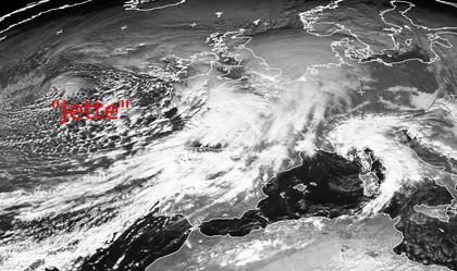 Die dichten Wolken des Sturmtiefs 'Jette' über den Britischen Inseln erstrecken sich am Dienstag Mittag vom Atlantik über Südwesteuropa bis zur Nordsee sowie nordwestlich auf den Atlantik hinaus. Westlich der Britischen Inseln zeigt das Satellitenfoto typische Schauerbewölkung. Dieses Tiefdrucksystem zieht nun rasch nach Westen weiter und bringt auch in Deutschland Regen und viel Wind. Über dem Golf von Genua liegt ein weiteres, aber nur kleines eigenständiges Tief, das auch hier für Regen, teils auch Gewitter und Wind sorgt. (Bildquelle: NERC Satellite Receiving Station, Dundee University, Scotland, http://www.sat.dundee.ac.uk/)
