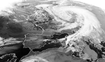 Das Satellitenbild zeigt ein Sturmtief mit Kern über der südlichen Ostsee, das auf dem Höhenpunkt seiner Entwicklung steht: die kalte Luft auf der Rückseite hat den Kern fast umrundet. Sobald dies geschehen ist wird das Tief von seiner Energiequelle abgeschnitten und füllt sich auf. Das markante Wolkenband über dem Südwesten und Westen Deutschlands gehört zur einer schwachen Frontalzone, die quasi in das Sturmtief mit eingesaugt wird und sich entsprechend verformt.