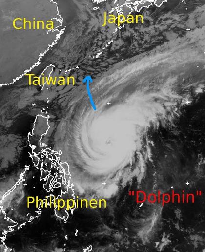 Der Tropensturm 'Dolphin' hat sich seit gestern verstärkt und wird bei Windgeschwindigkeiten von 120 km/h im Mittel und 150 km/h in Böen nun als Taifun eingeordnet. In der Mitte des Taifuns zeichnet sich deutlich das Auge, also der windstille Bereich des Taifuns, ab. Die Philippinen werden nur im Osten vom Taifun gestreift. 'Dolphin' bewegt sich jetzt nach Norden weiter, wird aber an Stärke verlieren, da die Wassertemperaturen im Norden nicht mehr ausreichen, um den Taifun mit Energie zu versorgen. (Bildquelle: Copyrigt EUMETSAT, NERC Satellite Receiving Station, University of Dundee)
