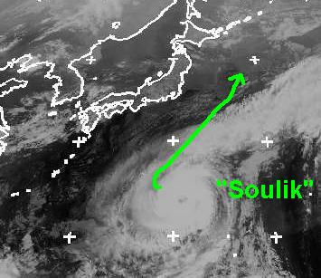 Auf dem Satellitenbild von Freitag früh ist das Auge des Taifuns 'Soulik' gut zu erkennen. Zurzeit erreicht er mittlere Windgeschwindigkeiten von 160, in Böen 195km/h und soll sich noch weiter verstärken. Berechnungen zufolge soll er südlich von Japan nach Nordosten ziehen. Ob die Ausläufer des Taifuns die Südküste Japans erreichen ist noch unklar.
