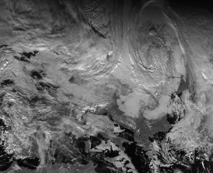 Europa zeigt sich zu großen Teilen unter dichten Wolken. Über dem Baltikum befindet sich Tief 'Ursula', über dem Europäischen Nordmeer befindet sich Tief 'Vesna'. Große Teile Mitteleuropas liegen unter Hochnebel.