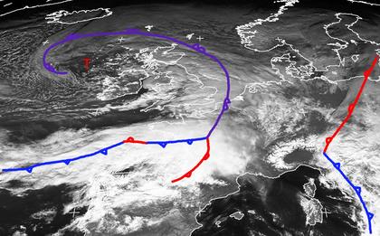 Während die Wolken des alten Tiefs 'Jette' bereits über Polen liegen, befindet sich das Tief 'Karin' mit seinem Zentrum kurz von den Britischen Inseln. Dichte Wolken der zugehörigen Tiefausläufer haben dabei vor allem Nordspanien und Südwestfrankreich erfasst, aber auch über der Nordsee und Großbritannien sind die Wolken zahlreich. Weiter nach Westen auf den Atlantik liegt auf der Rückseite dagegen Schauerbewölkung. Das Tiefdrucksystem überquert auf seinem Weg nach Osten in der Nacht auch Deutschland mit einigem Regen und Wind. (Bildquelle: NERC Satellite Receiving Station, Dundee University, Scotland, http://www.sat.dundee.ac.uk/)