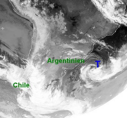 Der Ausschnitt zeigt ein kleines, aber kräftiges Tief über dem südwestlichen Atlantik nahe der argentinischen Küste, es hat sich an der Grenze zweier Luftmassen gebildet und sorgte für kräftige Niederschläge im Norden von Argentinien. Es bewegt sich langsam nach Osten und schwächt sich dabei ab. (Bildquelle: NERC Satellite Receiving Station, Dundee University, Scotland, http://www.sat.dundee.ac.uk/)