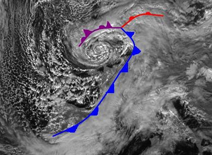 Das Tief 'Ohm' ist auf dem Satellitenbild von Sonntag Mittag gut zu erkennen. Seine Fronten erstrecken sich von Dänemark bis nach Spanien und bringen örtlich Regen. Schön zu erkennen sind auch die Schauerwolken, die sich hinter der Kaltfront entwickelt haben.
