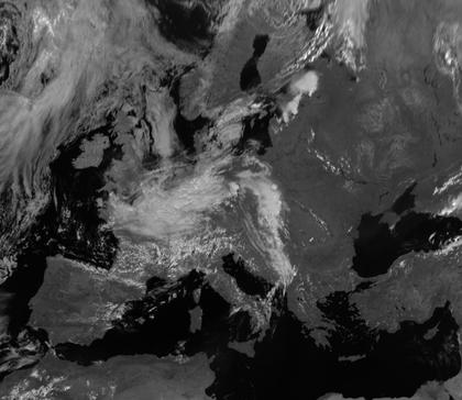 Tief 'Yvette' sorgt für dichte Wolken in Mitteleuropa. Südwest- und Osteuropa sind unter Hochdruckeinfluss wolkenarm.