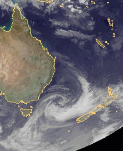 Das Satellitenbild zeigt ein ausgeprägtes Tiefdruckgebiet, das sich mit seinem Kern zwischen Tasmanien und Neuseeland befindet. Sehr schön ist erkennbar, dass sich auf der Südhalbkugel die Tiefdruckgebiete mit dem Uhrzeigersinn drehen, im Gegensatz zur Nordhalbkugel. Das aktuelle Tiefdruckgebiet hat mit einer westlichen Strömung für Sandstürme aus dem inneren Australiens an die Ostküste mit den Metropolen Sydney, Canberra, und Melbourne gesorgt.