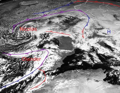 Die Fronten des Tiefs 'Nicolas' erstrecken sich heute mit den zugehörigen Wolken über die nördlichen Brititschen Inseln bis nach Westskandinavien und bis nach Nordwestdeutschland. Auch Tief 'Olander' hat einige Wolken im Gepäck, die über der Iberischen Halbinsel zu sehen sind. Hier kommt es neben einigem Regen auch zu viel Wind. Leichter Hochdruckeinfluss herrscht nach Osten hin vor, allerdings spielt hier häufig Hochnebel eine Rolle. Beide Tiefs verlagern sich bis zum Wochenende deutlich nach Osten weiter, sodass in Mitteleuropa insgesamt wechselhaftes Wetter vorherrschen wird. (Bildquelle: NERC Satellite Receiving Station, Dundee University, Scotland, http://www.sat.dundee.ac.uk/)
