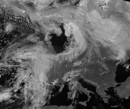 Ein Ausläufer von Tief 'Felicitas' nördlich von Schottland liegt mit dichten Wolken über Norddeutschland. Weiter nach Süden und Südosten gibt es auch wolkenfreie Gebiete, ein großes wolkenfreies Gebiet liegt aber auch auf der Rückseite des Ausläufers über der Nordsee. Über Südengland geht der Ausläufer von 'Felicitas' in einen Ausläufer des neuen Tiefs 'Gisela' mit Zentrum südwestlich von Irland über. Die Ausläufer von 'Gisela' ziehen am Samstag über Deutschland hinweg.