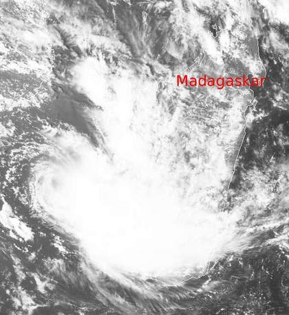 Der Tropensturm 'Elnus' über Madagaskar hat sich seit gestern kaum weiterbewegt. Er erreicht Windgeschwindigkeiten von 65, in Böen auch 85 km/h. Damit wird er noch nicht als Zyklon eingestuft. 'Elnus' wandert nun mit nur ca. 8 km/h in nördlicher Richtung weiter, verstärkt sich aber kaum noch. Während der Wind nicht allzu kräftig ist, bringt 'Elnus' auf Madagaskar jedoch teilweise erheblichen Niederschlag. (Bildquelle: NERC Satellite Receiving Station, Dundee University, Scotland, http://www.sat.dundee.ac.uk/)