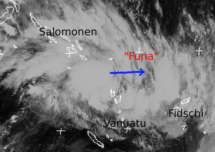 Im südlichen Pazifik hat sich zwischen den Salomonen und Vanuatu ein Tropensturm gebildet. Er wurde auf den Namen 'Funa' getauft und erreicht Windgeschwindigkeiten von 65 km/h im Mittel und 85 km/h in Böen. 'Funa' zieht nun mit einer Geschwindigkeit von 15 km/h in östlicher Richtung weiter und wird sich dabei noch etwas verstärken. Vor allem auf Vanuatu und der Inselgruppe Fidschi sind in den nächsten Tagen neben starken Wind heftige Niederschläge zu erwarten. (Bildquelle: NERC Satellite Receiving Station, Dundee University, Scotland, http://www.sat.dundee.ac.uk/)