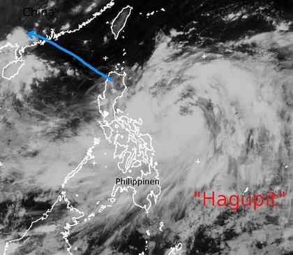 Der Tropensturm 'Hagupit' liegt heute Mittag mit seinen Wolken östlich vor den Philippinen. Aus den Wolken fällt teils heftiger Regen, der Wind erreicht 100 km/h im Mittel und bis 130 km/h in Böen. 'Hagupit' zieht nun in westliche Richtung weiter und damit über die Philippinen hinweg, dabei verstärkt er sich auch noch. (Bildquelle: Copyrigt EUMETSAT, NERC Satellite Receiving Station, University of Dundee)