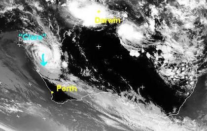 Auf dem Satellitenbild von Dienstag früh ist der tropische Sturm 'Clare' im Nordwesten des Kontinents gut zu erkennen. Er hat die Küste nahe Port Hedland mit Windgeschwindigkeiten von 110, in Böen 140 km/h erreicht und zieht nun weiter landeinwärts. Berechnungen zufolge soll er sich bis morgen auf Windgeschwindigkeiten von 55, in Böen 80 km/h abgeschwächt haben.