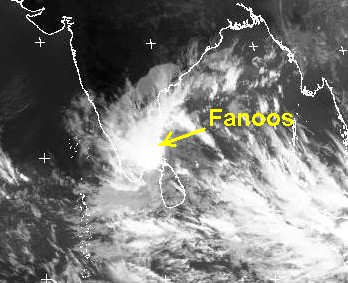Der tropische Sturm 'Fanoos' trifft heute mit Windgeschwindigkeiten von etwa 120, in Böen bis 150 km/h auf die Ostküste Indiens südlich von Madras und zieht dann unter Abschwächung ins Landesinnere.