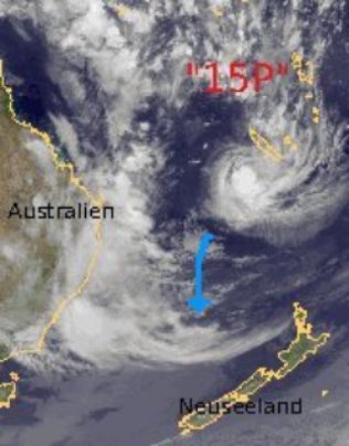 Südwestlich kurz vor der Küste Neukaledoniens befindet sich heute Mittag ein Tropensturm mit dem Codenamen '15P'. Mit 65 km/h Windmittel und bis 85 km/h in Spitzen ist er noch recht schwach. Zunächst wird er sich auch kaum verstärken und weiter nach Süden ziehen, womit Neukaledonien verschont bleibt. Ob seine weitere Zugbahn über Neuseeland verläuft, ist nach jetzigem Berechnungen noch nicht bekannt (c) DWD/Eumetsat