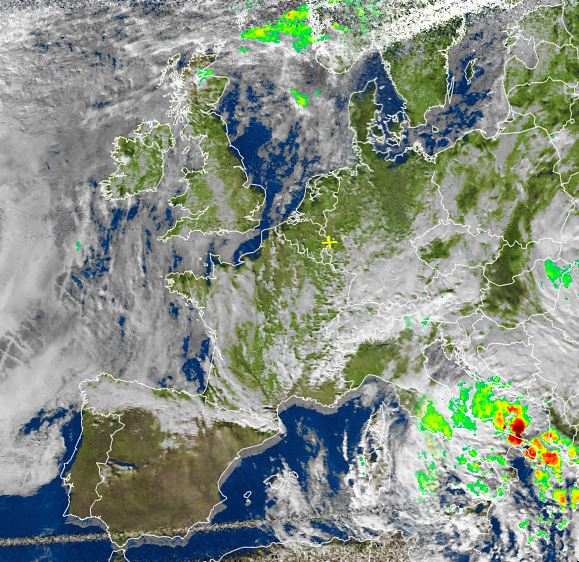 Auf dem Satellitenfoto von heute Nachmittag zeigen sich weite Teile von West-, Mittel- und Osteuropa locker oder aufgelockert bewölkt, gebietsweise hielten sich jedoch auch dichte Wolken. Ein Tief über Italien sorgt jedoch im zentralen Mittelmeer für verbreitet sehr nasses und unbeständiges Wetter, dabei sind vielerorts langanhaltende und ergiebige Niederschläge möglich.