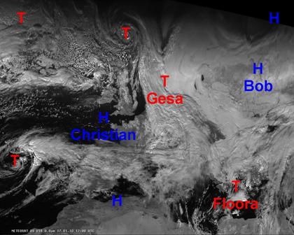 Das heutige Satellitenfoto zeigt Tief 'Gesa' mit Zentrum über Norddeutschland. Es bringt dem westlichen Deutschland verbreitet Tauwetter bei zeitweiligem Regen. Dagegen sorgt es von der Osthälfte Deutschlands bis weit nach Osteuropa hinein für verbreiteten Schneefall. Im östlichen Mittelmeerraum sorgt ein weiteres Tief für einzelne Schauer oder Gewitter. Auch im westlichen und zentralen Mittelmeerraum halten sich meist viele Wolken, diese bringen aber nur gebietsweise etwas Regen. Freundlicher ist es durch Hoch 'Christian' von den Britischen Inseln bis Frankreich, sowie im Süden Spaniens.