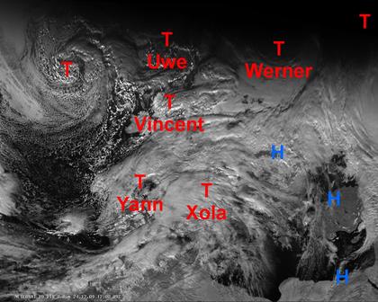 Das Satellitenfoto von heute Nachmittag zeigt verbreitet Tiefdrucksysteme über Europa. Sie sorgen von der Iberischen Halbinsel im Südwesten bis nach Nordskandinavien für meist starke oder dichte Bewölkung und meist nasskaltes Wetter. Vor allem im Norden auch für häufige Schneefälle. Im Osten und Südosten ist es unter Hochdruckeinfluss dagegen meist trocken, vielfach allerdings auch neblig trüb oder hochnebelartig bewölkt.