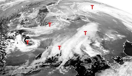 Auf dem Satellitenbild von Samstag früh sind fünf Tiefdruckgebiete zu erkennen. Sie bestimmen heute das Wetter in Europa mit vielen Wolken und zum Teil kräftige Schauer oder Schneefälle. Dabei gelangt feucht-kalte Luft vor allem nach Nord und Westeuropa.