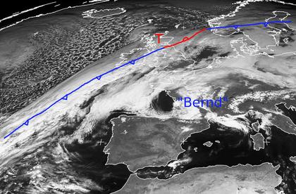 Zwar hält das Hoch 'Bernd' über Frankreich die Fronten heute in Mitteleuropa meist noch fern, häufig haben sich jedoch hochnebelartige Wolken gebildet, die die Sonne verdecken. Weniger Wolken sind über Südfrankreich sowie verbreitet über der Iberischen Halbinsel und dem Mittelmeer zu finden. Im Nordwesten dagegen befinden sich schon die Wolken eines Frontensystems, das morgen Hoch 'Bernd' nach Südosteuropa zurückdrängt und damit in Mitteleuorpa wechselhafteres, kühleres und windiges Wetter einleitet. (Bildquelle: NERC Satellite Receiving Station, Dundee University, Scotland, http://www.sat.dundee.ac.uk/)