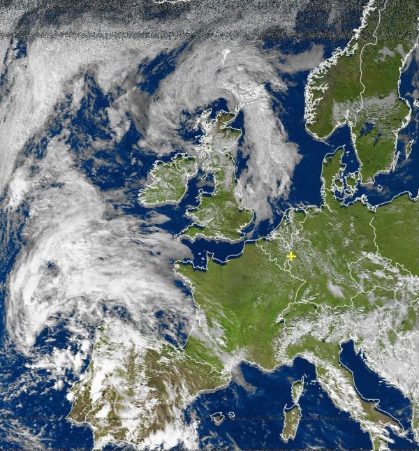 Auf dem Satellitenbild von heute Nachmittag sind besonders gut die Tiefdruckgebiete nördlich von Großbritannien sowie nordwestlich der Iberischen Halbinsel zu erkennen. Dabei herrscht vor allem in weiten Teilen Schottlands, gebietsweise auch im Norden Irlands, sowie an der Biskaya und im Nordwesten der Iberischen Halbinsel sehr wechselhaftes Wetter mit zeitweiligen Schauern und Gewittern. Sonst ist es unter Hochdruckeinfluss in weiten Teilen Mitteleuropas bis nach Skandinavien verbreitet heiter bis sonnig und trocken.
