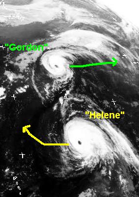 Auf dem Satellitenbild von Montag früh sind die Augen der beiden Wirbelstürme 'Helene' und 'Gorden' gut zu erkennen. Sie werden die Amerikanische Küste aber voraussichtlich nicht erreichen. Zurzeit erricht Sturm 'Gordon' noch mittlere Windgeschwindigkeiten von 130, in Böen 157km/h und zieht unter Abschwächung nach Osten. Berechnungen zufolge soll er am Mittwoch auf die Azoren treffen. Der Wirbelsturm 'Helene' erreicht zurzeit mittlere Windgeschwindigkeiten von 195, in Böen 240km/h bewegt sich in Richtung Bermudas. Sein Endziel ist allerdings noch unklar.