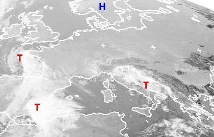 Auf dem Satellitenbild von Dienstag früh sind weite Teile Europas durch den Einfluss des Hochs über Skandinavien nahezu wolkenfrei. Am Süd- und Westrand des Hochs halten sich dagegen die Wolken einiger Tiefdruckgebiete. Diese Tiefs sorgen heute vor allem von Südspanien bis in die Biscaya und über der Adria für Schauer und Gewitter. (Bildquelle: NERC Satellite Receiving Station, Dundee University, Scotland, http://www.sat.dundee.ac.uk/)
