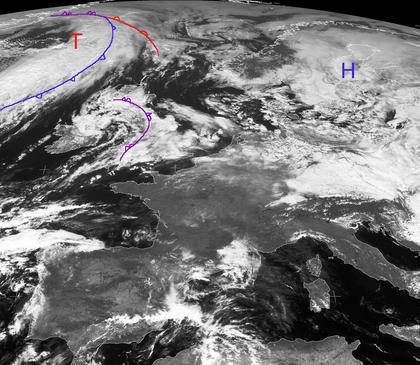 Hoch 'Dieter' über dem westlichen Russland bringt in Mitteleuropa meist ruhiges Frühherbstwetter. Allerdings zeigt das Satellitenfoto von heute Mittag, dass es in seinem Einflussbereich häufig auch stärker bewölkt ist. Ursache dafür ist vor allem eine Strömung kühler Luft über die noch recht warme Ostsee, die Wolkenbildung zur Folge hat. In Nordwesteuropa dagegen liegen bereits die Wolken des Ex-Hurrikans 'Ike', das sich gegen die blockierende Wirkung des Hochs aber kaum durchsetzen kann und so auf eine nördliche Bahn gezwungen wird. (Bildquelle: Copyrigt EUMETSAT, NERC Satellite Receiving Station, University of Dundee)