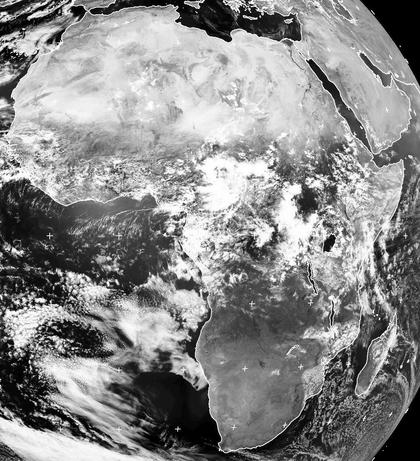 Wolken findet man über Afrika derzeit hauptsächlich in den mittleren Teilen des Kontinents, nahe dem Äquator und etwas weiter nördlich. Hier kommt es zu tropischen Schauern und Gewittern. Über dem Norden und Süden Afrikas sind dagegen weite Regionen wolkenfrei. Einige lockere Wolken gibt es aber auch über Mosambik.