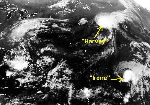 Der Ausschnitt zeigt zwei tropische Stürme über dem Atlantik. Der eine von ihnen mit dem Namen 'Irene' hat sich südwestlich von den Kanarischen Inseln aufgebaut und verlagert sich unter Verstärkung nach Nordwesten, im Laufe der Woche erreichen seine Windgeschwindigkeiten etwa 93 km/h, auf seiner Zugbahn liegen keine bewohnten Inseln. Der tropische Sturm 'Harvey' überquert den Atlantik von Südwest nach Nordost und schwächt sich schon ab, nahe seinem Auge werden etwa 85 km/h gemessen.