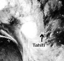 Westlich von Tahiti liegt ein Zyklon mit mittleren Windgeschwindigkeiten bei 130km/h und Böen bis 155 km/h. Er zieht aber weiter nach Südosten und schwächt sich dabei wieder ab. Die Inseln werden nur gestreift. (Bildquelle: NERC Satellite Receiving Station, Dundee University, Scotland, http://www.sat.dundee.ac.uk/)