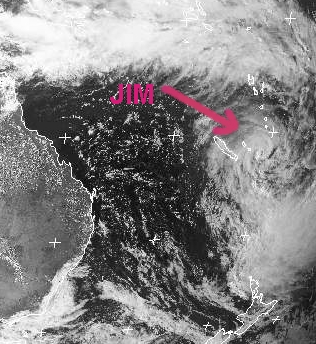 Nicht besonders auffällig zwischen ausgedehnten Wolkenschirmen im Norden und Süden liegt der tropische Zyklon 'Jim' östlich von Neukaledonien. Zur Zeit erreicht er dennoch mittlere Windgeschwindigkeiten von 150km/h und Böen von 185 km/h. Seine weitere Zugrichtung ist unsicher. Voraussichtlich wird er unter Abschwächung südwärts in Richtung Neuseeland ziehen, die Nordinsel aber vermutlich nicht erreichen.
