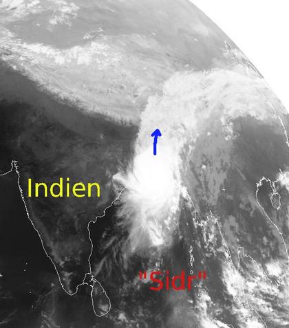 Der Zyklon 'Sidr' über dem Golf von Bengalen liegt heute Mittag mit seinem Zentrum kurz vor Bangladesh. Ein Wolkenband, das von dem Zyklon ausgeht, reicht sogar bis weit nach China hinein. 'Sidr' erreicht zur Zeit Windstärken von 250 km/h im Mittel und über 300 km/h in der Spitze. Neben Bangladesh liegt auch die Millionenmetropole Kalkutta in Indien im stärksten Wirkungskreis des Zyklons, hier drohen massive Schäden und starke Überschwemmungen. An Land wird sich der Sturm schnell abschwächen, die Regenfluten bleiben aber noch erhalten. (Bildquelle: NERC Satellite Receiving Station, Dundee University, Scotland, http://www.sat.dundee.ac.uk/)